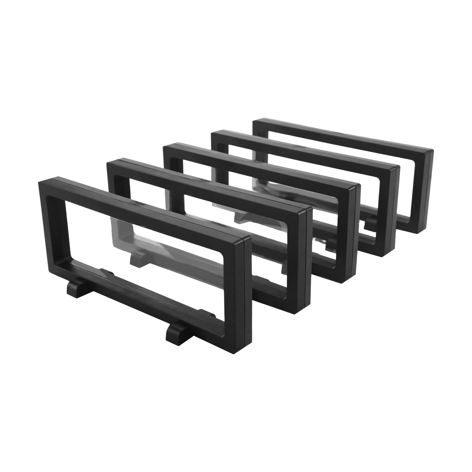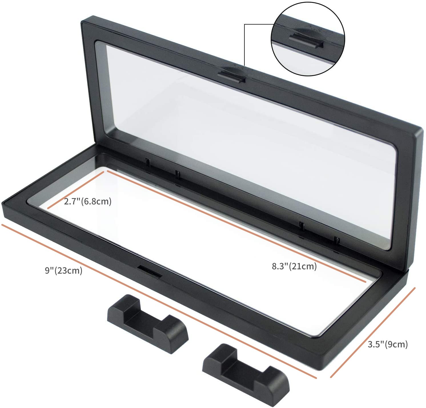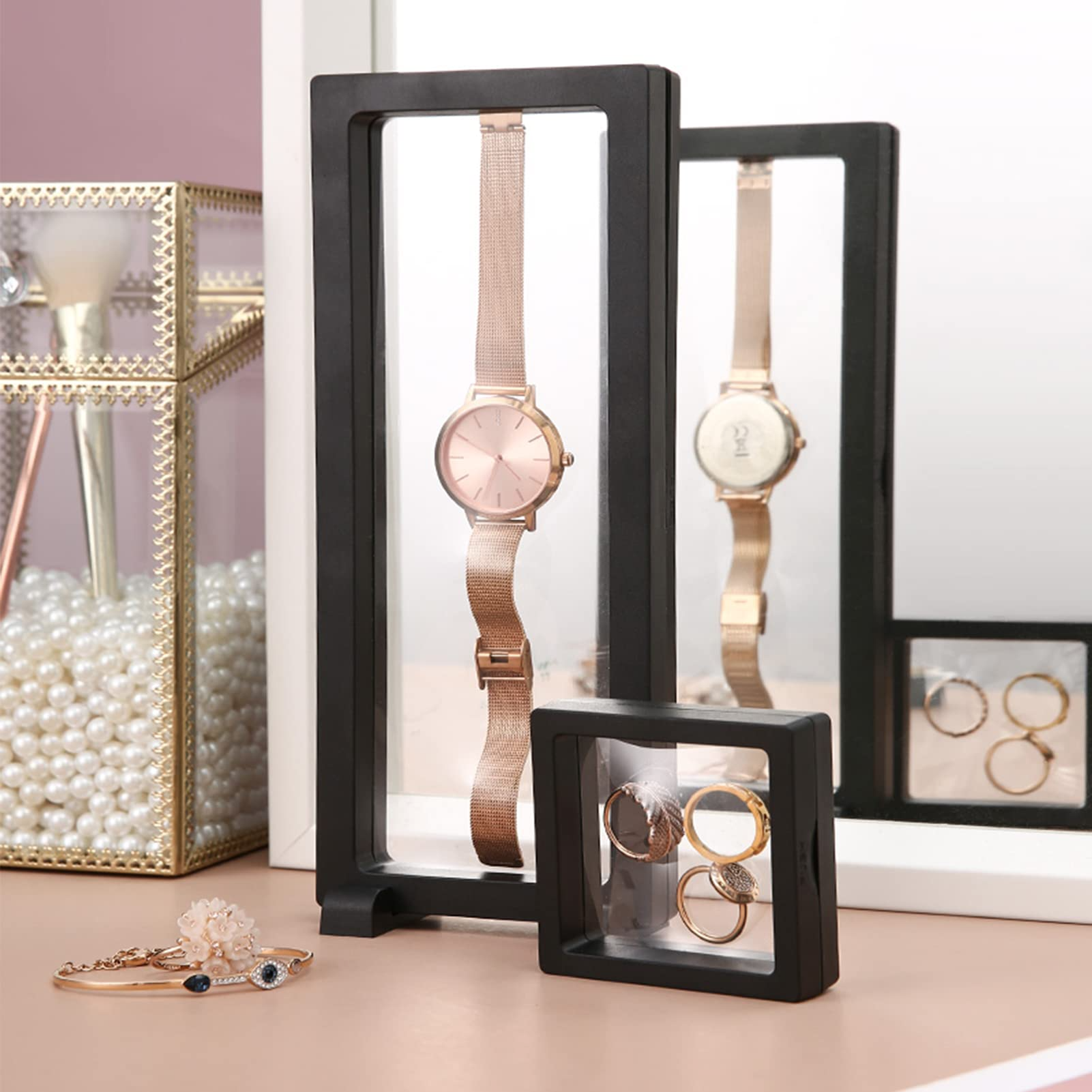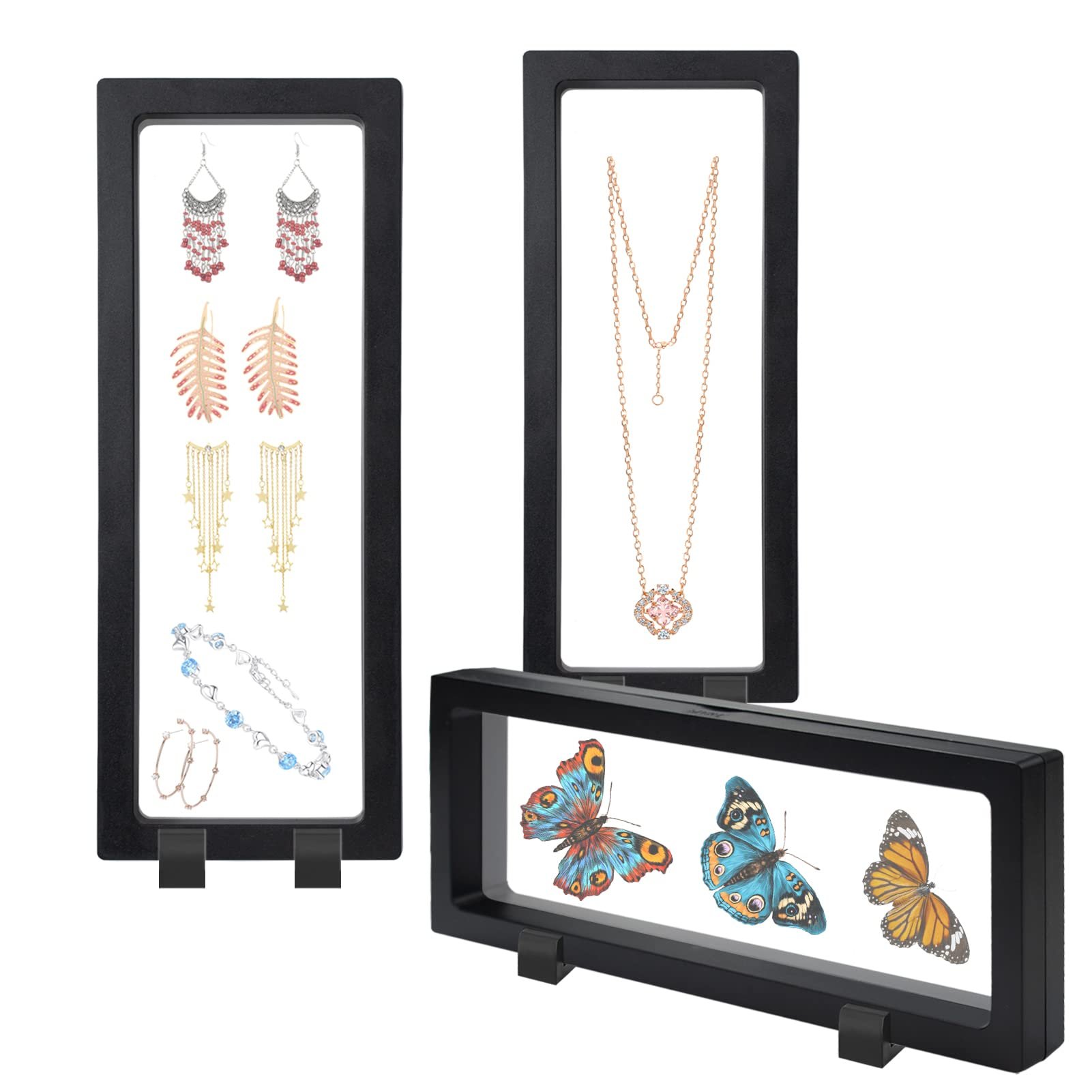 【 3D Floating Frame with Stand】Display your necklaces and other collectibles in a unique and creative way. Get 5 large black transparent display frame holders with 5 pairs of rectangular black stands.