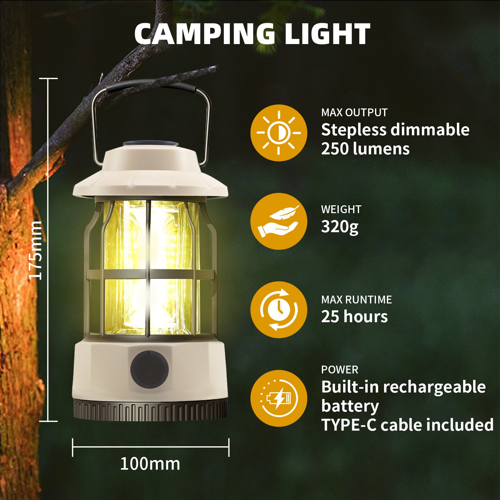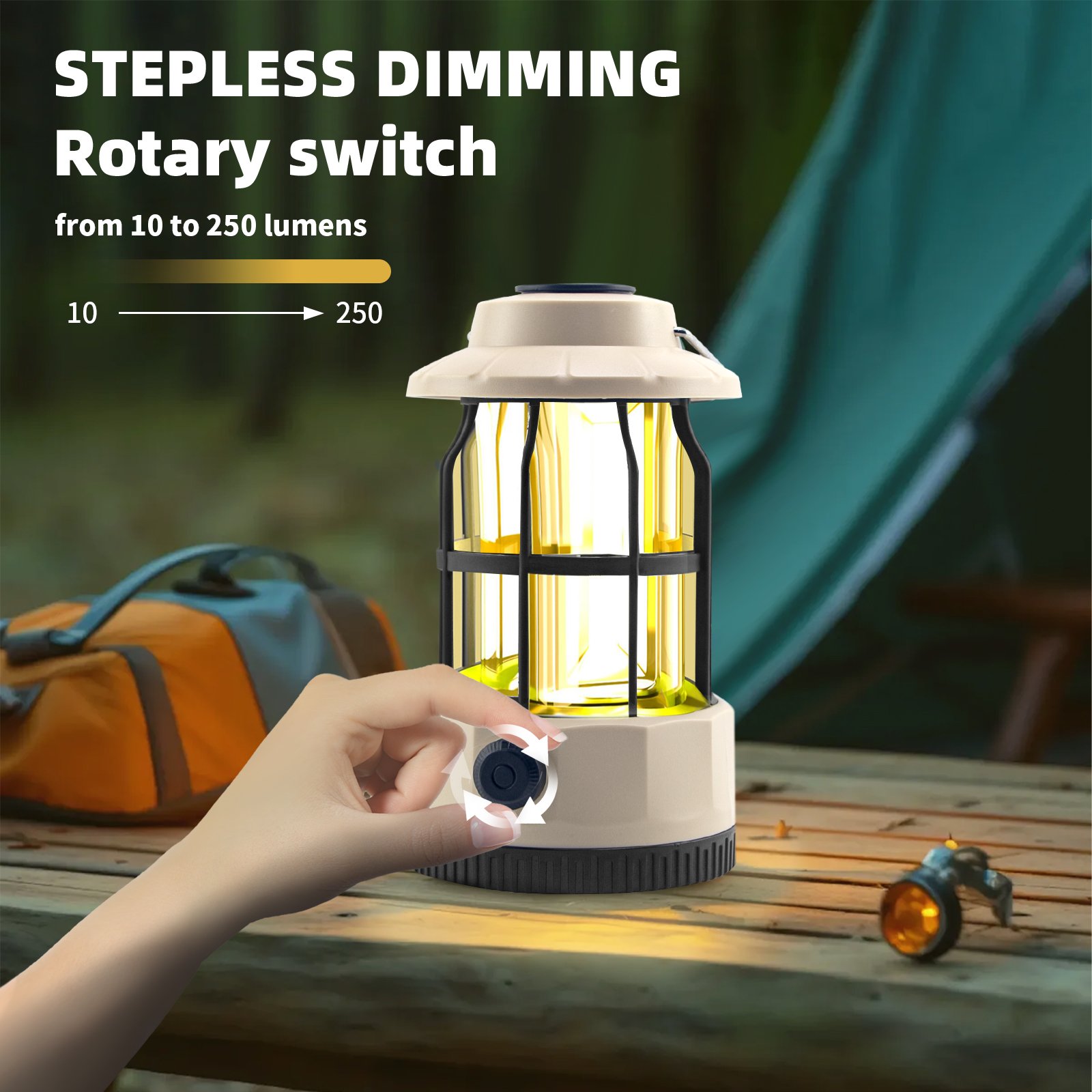 【 Bright & Dimmable】This camping light features 16 high-quality COB bulbs, providing a maximum output of 250 lumens with a 360° lighting effect. The rotary switch for stepless dimming allows you to adjust the brightness to your preference.